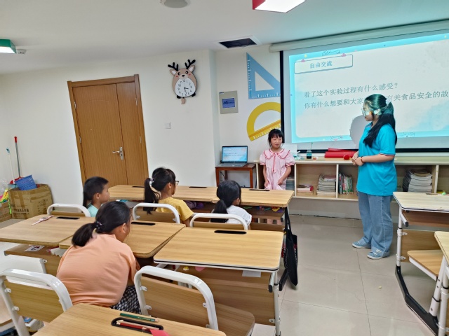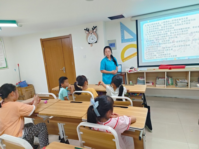 7月8日下午,合肥學院教育學院“七彩童年,‘育’你相伴”志愿團隊來到濱湖和園社區開展社會實踐活動,志愿者侯鑫宇作為授課老師為孩子們帶來一堂以“身心成長”為主題的飲食健康課程。 “國以民為本,民以食為天,食以安為先,”食品安全關系著我們的日常生活和健康狀況。《中國學齡兒童膳食指南(2022)》報告指出,目前我國學齡兒童營養與健康狀況面臨三重挑戰,即營養不足、微量營養素不足、超重和肥胖,不少兒童喜歡吃零食等不健康的食品,飲食習慣非常不好。并且學齡期作為一個人飲食行為和生活方式形成的關鍵時期,對養成健康的飲食行為和生活方式十分重要。 健康成長的第一要素是學會培養合理的飲食習慣,因此,在課程開始之前,侯鑫宇老師首先對孩子們的飲食狀況進行了調查。調查顯示大部分的兒童喜歡吃油炸類,膨化類等食品,造成這些不健康的飲食習慣的主要原因是兒童對營養知識的缺乏以及父母對兒童飲食健康習慣的忽視。在此基礎上,侯鑫宇老師先向孩子們介紹了我國九類垃圾食品的種類以及危害。臺下的孩子們一邊跟著老師念著垃圾食品的危害,一邊小聲地說著下次一定少吃垃圾食品。“那老師,哪些食品是健康的呢?”“我們要多吃綠色的蔬菜與新鮮的水果,每天補充蛋白質,注意飲食的多樣性,這樣身體才會健康。”