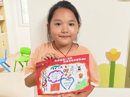 “家”的文化只有在分享與傳承中才能歷久彌新。志愿者不僅帶領(lǐng)孩子們學(xué)習(xí)了各民族的文化,還鼓勵孩子們分享自己民族的故事與習(xí)俗。孩子應(yīng)當(dāng)在生活的點(diǎn)滴小事中發(fā)現(xiàn)并了解自己獨(dú)特的家鄉(xiāng)文化,從漢字墨香溫存的一筆一劃中體悟時(shí)代傳承中的表達(dá)。此次課程中張曉潔讓孩子們圍繞“民族團(tuán)結(jié)一家親,同心共筑中國夢”這一主題繪制手抄報(bào),孩子們都深刻感悟了此次課程所學(xué),手抄報(bào)或筆觸細(xì)膩,或圖文并茂。孩子們還積極分享了自己的手抄報(bào)作品,用樸素的語言表述了自己的創(chuàng)作思路,流露出對中華民族一家親、共同鑄就中國夢的真摯期愿。