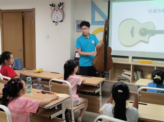 7月4日下午,合肥學院教育學院“七彩童年,‘育’你相伴”志愿團隊前往合肥市包河區濱湖和園社區開展“三下鄉”社會實踐活動。李碩碩、沈葉天兩位志愿者共同將音樂帶進社區,為孩子們帶來了一節生動的吉他教學課。課程的主要目的是讓孩子們在了解有關吉他樂理知識的同時,培養他們對音樂的興趣,陶冶情操。 有這樣一種樂器,不管是在茶余飯后的家庭音樂會,還是在學校操場的草坪上,人們都能隨時隨地和它一起彈唱,這種樂器就是吉他。吉他的和弦是夏日的浪漫,迎著午后炙熱的陽光,志愿者將孩子們迎進教室。上課前,志愿者的手指輕彈琴弦,為孩子們彈奏了本節課要學習的歌曲——《小星星》,跳動的音符如精靈一般,在空中翩翩起舞。孩子們都聽得如癡如醉,迫不及待地想要了解有關吉他的知識。課程開始后,志愿者先簡單介紹了吉他,并教孩子們如何去區分三種不同類型的吉他。緊接著,志愿者通過圖片展示的方式,帶領孩子們了解吉他的結構、功能及其演奏姿勢。為了讓孩子們更直觀地感受到音樂的魅力,志愿者讓孩子們自己動手彈奏吉他,并在一旁耐心地給孩子們傳授彈奏的技巧,細心地糾正他們的錯誤。在志愿者的指導下,許多孩子都可以簡單地彈奏一些音符。在課程的最后,兩位志愿者和孩子們一起隨著吉他的伴奏,合唱了三首耳熟能詳的兒歌:《小星星》、《粉刷匠》、《兩只老虎》。“一閃一閃亮晶晶,滿天都是小星星。”在教室里,孩子們稚嫩的歌聲和志愿者的領唱聲交織,一同譜寫出屬于這個夏天的悠揚樂章。志愿者們用音樂走進孩子們的內心,讓他們在音樂中享受童年的快樂。