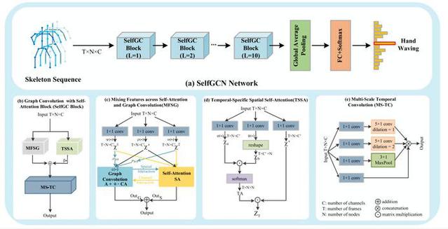 為此,研究團隊提出了SelfGCN模型,該方法基于圖卷積網絡構建人體骨架的拓撲結構,并引入自注意力機制,以自適應地調整關節節點的重要性權重,從而更精準地捕捉動作特征。這一研究工作為基于圖結構數據的人體動作識別提供了新的思路,有助于進一步理解和優化人體運動特征的建模方法。