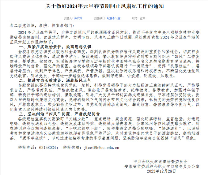 現(xiàn)將中共合肥大學(xué)紀(jì)律檢查委員會、安徽省監(jiān)委派駐合肥大學(xué)監(jiān)察專員辦公室《關(guān)于做好2024年元旦春節(jié)期間正風(fēng)肅紀(jì)工作的通知》轉(zhuǎn)發(fā)給你們,請認(rèn)真學(xué)習(xí)領(lǐng)會,嚴(yán)格執(zhí)行有關(guān)規(guī)定。