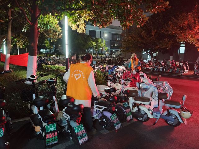 在校園的一些停車點附近,隨處可見生物院志愿者們忙碌的身影。他們將那些隨意停放的自行車和電動車整理擺放在合適的停車點,將不小心倒下的車輛扶正。在他們的努力下,宿舍樓下原本雜亂的停車區變得井然有序。同學們的出行變得更加暢通無阻,不再需要從混亂的車堆中艱難前行。消除了車輛亂停可能導致的安全隱患,為校園營造了更加安全和諧的環境,同時為校園文明建設獻出了一份自己的力量。