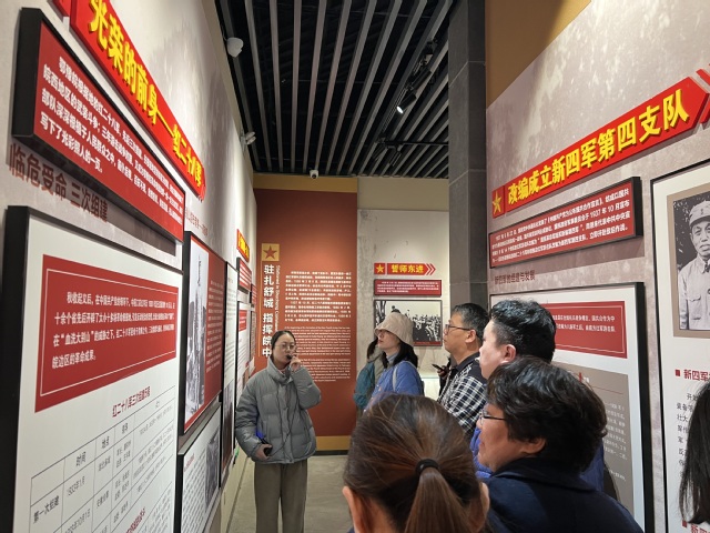 新四軍第四支隊司令舊址共有三個部分,包括200多米長的進館棧道、紅軍廣場及司令部舊址。其中司令部舊址分前廳和后廳兩大部分,前廳主要介紹了新四軍四支隊的發展歷史,配有葉挺、高敬亭等六位將軍的浮雕,以及四支隊戰士們使用的武器、戰地沙盤等展示,后廳介紹了當時主要的戰役戰斗,并以聲光電、情景再現等形式進行了展示。在講解員的帶領下,全體黨員懷著無比崇敬的心情參觀了新四軍第四支隊司令部舊址。一幅幅珍貴的歷史照片、一件件飽經滄桑的革命文物、一段段感人至深的英雄故事,生動再現了新四軍將士們英勇抗戰的光輝歷史,讓大家深刻感受到革命先輩們堅定的理想信念、頑強的斗爭精神和崇高的愛國情懷。