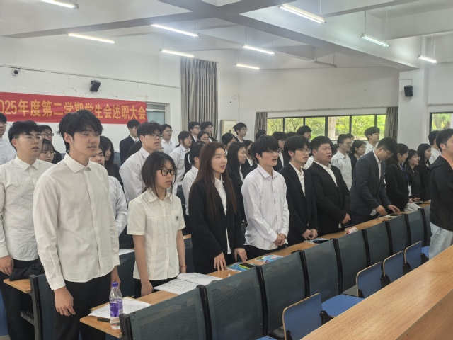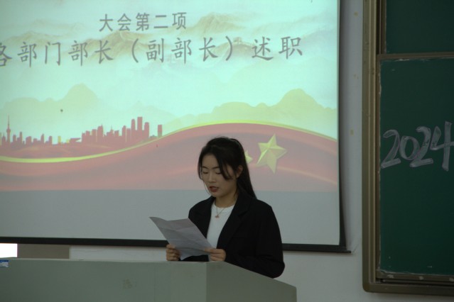 大會伊始,由主持人曠家昱上前致辭,宣布大會開始。大會第一項,全體起立,奏唱共青團團歌,在一聲聲莊嚴的團歌渲染下,全體成員不禁面容莊重,共唱共青團團歌。大會第二項,由各部門部述職,各部長講述了各自部門的工作成果、不足之處、未來規劃以及感謝寄言。大會第三項,由主席團代表成曉超進行全面述職。在過去的一年里,學生會秉持“全心全意為同學服務”的宗旨,扎實推進各項工作,豐富同學們課余生活,展現了生會積極進取、追求卓越的決心。大會第四項,院團委負責人楊林對學生會的工作做出指導,希望各部門充分發揮學生組織的示范引領作用,為學校發展和同學成長貢獻更多青春力量。大會最后一項,李秀娟做總結講話對學生會成員的辛勤付出給予高度贊揚,強調學生會要始終堅持正確的政治方向并結合自身經驗希望學生會以此次述職大會為契機,總結經驗、正視不足,加強自身建設。