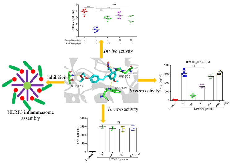 據統計,目前全球有700萬炎癥性腸病患者,且發病率還在持續上升,且臨床上缺乏安全有效的治療藥物。為了開發治療炎癥性腸病藥物,該團隊基于“食藥同源”的理念,多年來一直圍繞天然產物紫檀芪開展結構優化和藥用性質研究工作。目前成功設計合成出一種新型、高效的核苷酸結合寡聚化域樣受體家族3(NLRP3)抑制劑,該抑制劑具有良好的抗炎活性和成藥性,在動物實驗中表現出較好的生物學活性,具有進一步開發的潛力和價值,為天然產物紫檀芪藥用性質開發提供了參考。該研究得到了安徽省自然科學基金、安徽省高校自然科學研究項目、安徽省重點研發計劃項目以及合肥學院人才項目的資助和支持。