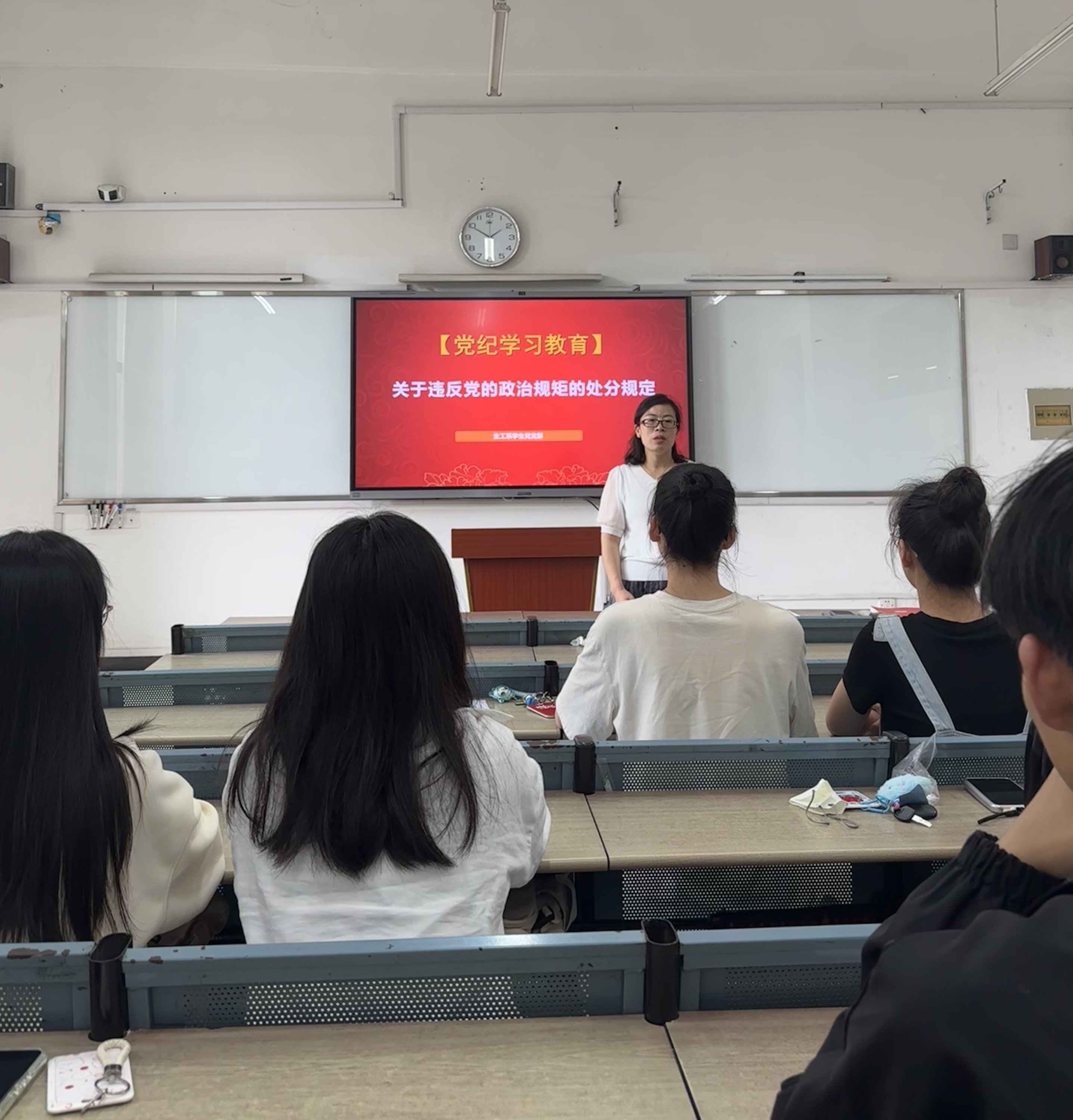 黨課臨近尾聲,陳玲老師再次強調:遵守紀律不僅是對組織的尊重,更是對自己的負責。每一位黨員同學都需要筑牢思想防線、繃緊紀律之弦,時刻把遵規守紀刻印在心。