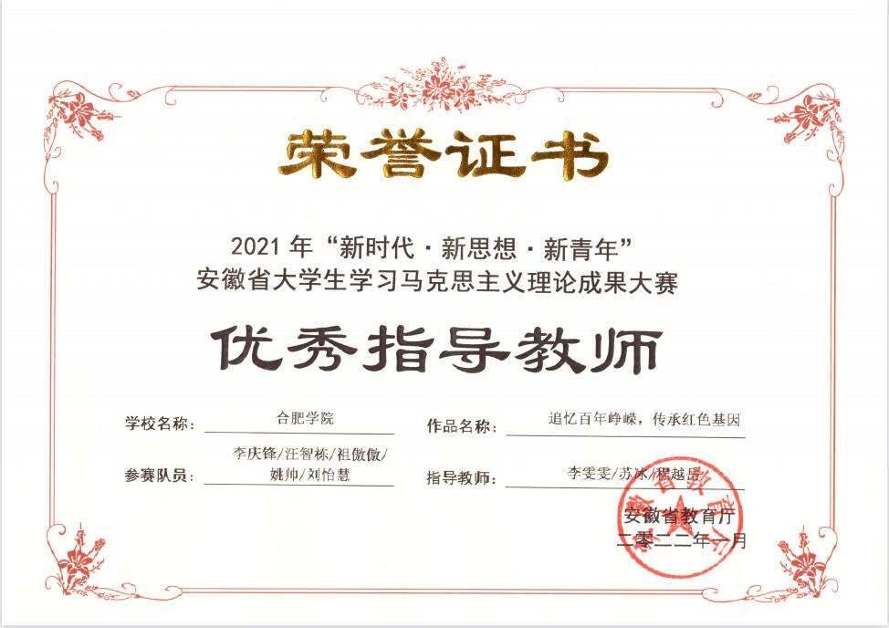 近日,2021年“新時代?新思想?新青年”安徽省大學生學習馬克思主義理論成果大賽評審結果在安徽省教育廳網站公布。我校選送的5件作品有2件獲獎,其中一等獎1項、三等獎1項,這是我校在此賽事中首次實現榮獲一等獎的突破。三位教師獲優秀指導教師獎。