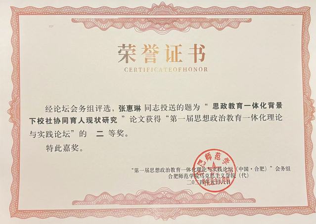 1月6日,第一屆“大中小學思想政治教育一體化”理論與實踐論壇在合肥舉行。我院教師張惠琳博士受邀參會,所提交論文榮獲二等獎。