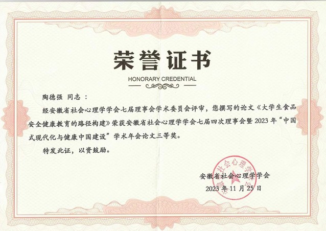 11月25日,安徽省社會心理學會七屆四次理事會暨2023年學術年會在銅陵召開。我院教師陶德強博士受邀參會,所提交論文榮獲年會論文三等獎。
