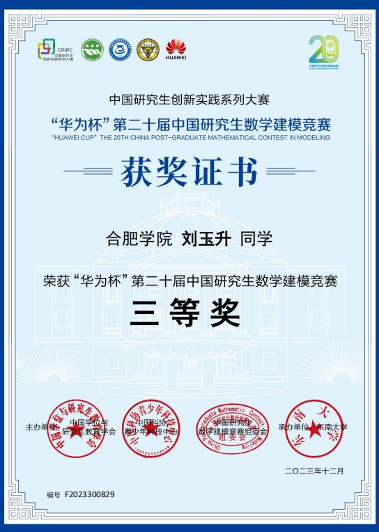 劉玉升始終秉持“以賽促學、以賽促研”的理念,積極參與各類高水平學科競賽,在實踐中不斷拓展學術視野、提升創新能力。在2023年“華為杯”第二十屆中國研究生數學建模競賽中,他帶領團隊克服重重困難,最終榮獲國家三等獎。