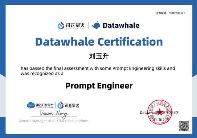 2024年6月至9月,在導師推薦下,劉玉升通過選拔進入科大訊飛股份有限公司訊飛數碼研究院實習,深度參與了訊飛星火大模型的研發工作,主要負責Prompt工程優化任務。憑借扎實的專業基礎和出色的工程能力,他系統性地完成了各類任務的整編工作,通過深入分析客戶需求,制定了差異化的Prompt優化策略。在數據處理層面,他運用Python對訓練數據進行清洗與統計分析,成功構建了包含10萬余條的高質量SFT數據,覆蓋33個具體任務場景。此外,他還參與了大模型效果的評測工作,為后續模型的迭代優化提供了支持。