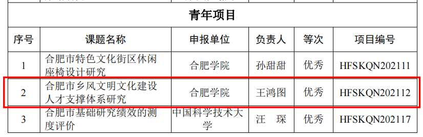 2021年度合肥市哲學社會科學規(guī)劃項目共83個一般項目正常結(jié)項。其中優(yōu)秀等次項目28個,良好等次項目55個。王鴻圖的《合肥市鄉(xiāng)風文明文化建設(shè)人才支撐體系研究》項目順利結(jié)項,成為28個優(yōu)秀等次項目之一。