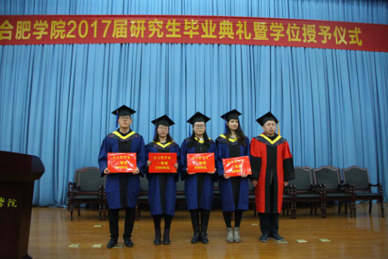 畢業(yè)生代表陳靜怡同學發(fā)言,她講述了自己在合院求學的過程,尤其是在讀研期間創(chuàng)建“南艷綠藝”創(chuàng)客空間時,導師們給予的指導、關心和幫助,自己也被評為優(yōu)秀畢業(yè)生并獲得國家獎學金,并表達了對母校的感恩和祝福。校外導師代表李文兵高工和校內導師代表劉俊生教授代表全體研究生導師祝賀同學們獲得碩士學位,并希望同學們堅持自己的理想目標,不忘使命,揚帆遠航,不斷向社會學習,從優(yōu)秀走向卓越。 接著,研究生處處長伍德勤宣讀了學校文件《關于表彰合肥學院2017屆碩士研究生優(yōu)秀畢業(yè)生、優(yōu)秀畢業(yè)論文和“合大環(huán)保獎學金”獲得者的決定》,學生處董承軍處長、生環(huán)系主任俞志敏教授和書記俞志敏教授、安徽合大環(huán)境監(jiān)測有限責任公司韓蔚總經(jīng)理分別為優(yōu)秀畢業(yè)生、優(yōu)秀畢業(yè)論文和“合大環(huán)保獎學金”獲得者頒獎。