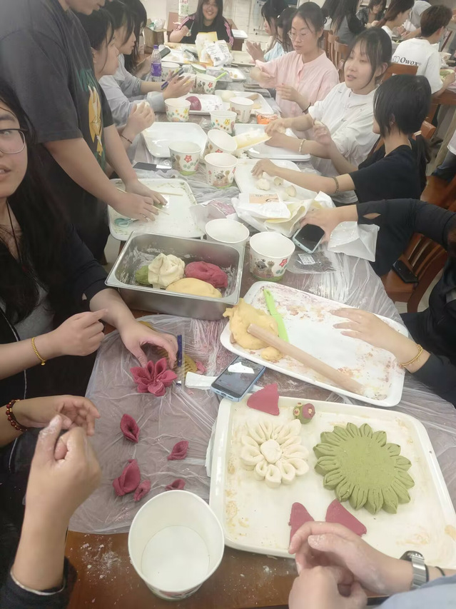 同學(xué)們分組行動,各顯身手,食堂內(nèi)一片熱火朝天的景象,各小組分工明確,有人揉面,有人塑形,有人裝飾。面粉在指尖翻飛,不一會兒,憨態(tài)可掬的小豬、靈動的蝴蝶、盛開的花朵等造型各異的花饃便紛紛成型。大家互相交流經(jīng)驗,分享創(chuàng)意,歡聲笑語回蕩在食堂中。