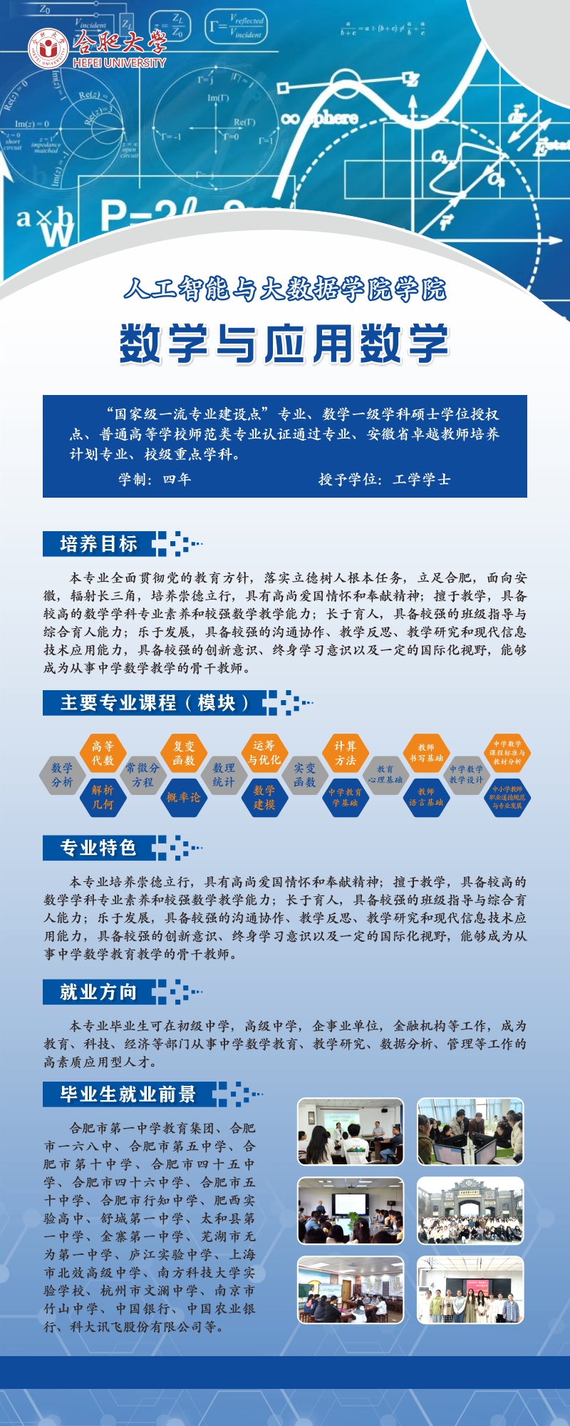 培養目標及特色:本專業立足合肥,面向安徽,輻射長三角,培養德、智、體、美、勞全面發展,具有高尚愛國情懷和奉獻精神,擅于教學,具備較高的數學學科專業素養和較強數學教學能力,具備較強的溝通協作、教學反思、教學研究和現代信息技術應用能力,具備較強的創新意識、終身學習意識以及一定的國際化視野,能夠成為從事中學數學教學工作的骨干教師。本專業借鑒德國應用科學大學的人才培養模式,構建了以數學專業知識與教育教學知識為基礎,注重邏輯思維能力、教育教學實踐能力、創新能力、終生學習能力培養的模塊化人才培養體系,并已通過教育部師范類專業認證進校考察。