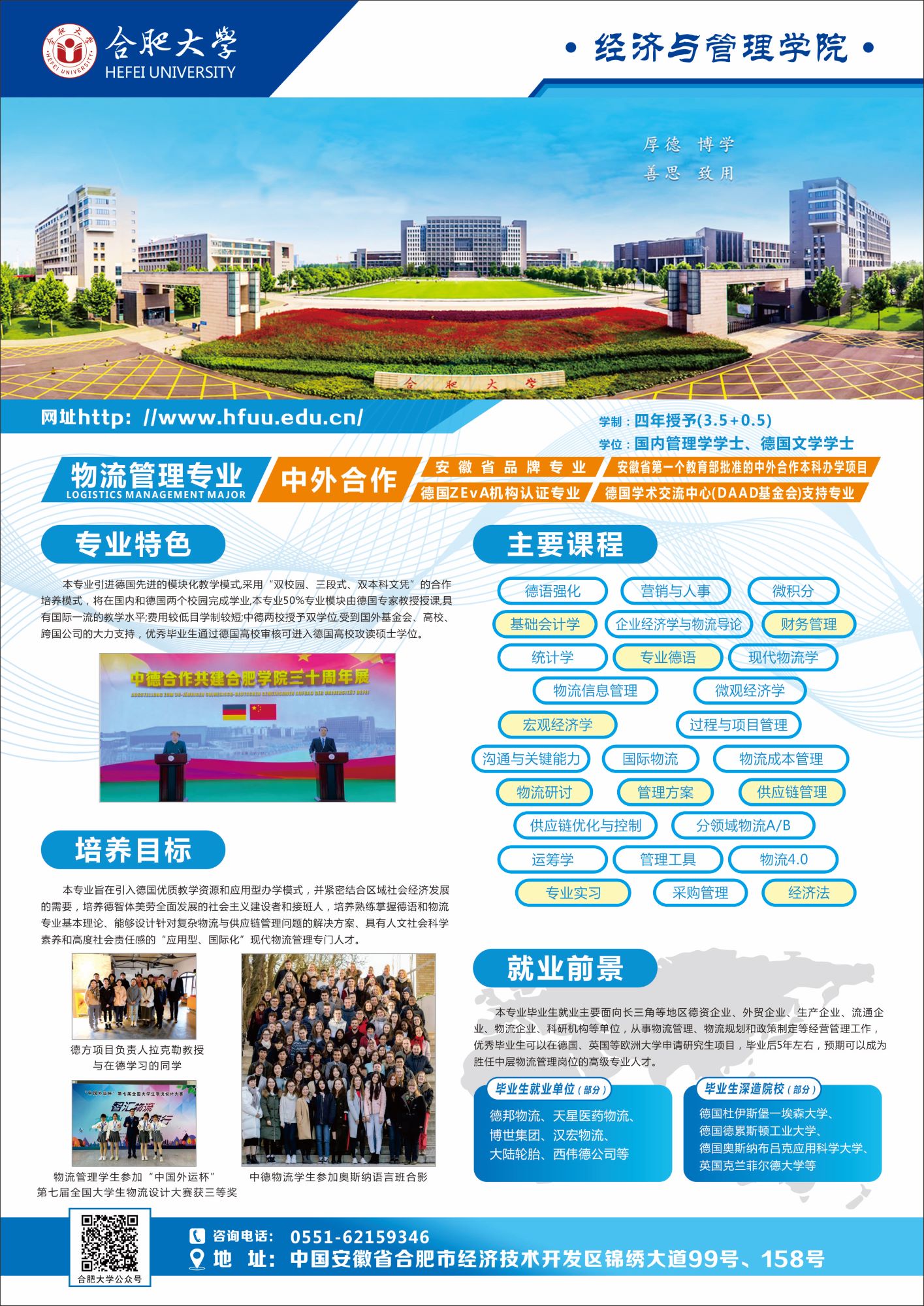 本專業借鑒德國應用科學大學培養應用型人才的辦學模式,利用合肥大學和德國奧斯納布呂克應用科學大學的優質教學資源,緊密結合區域社會經濟發展的需要,培養德、智、體、美、勞全面發展,熟練掌握德語和物流專業基本理論、能夠設計針對復雜物流與供應鏈管理問題的解決方案、具有人文社會科學素養和高度社會責任感的“應用型、國際化”現代物流管理專門人才。