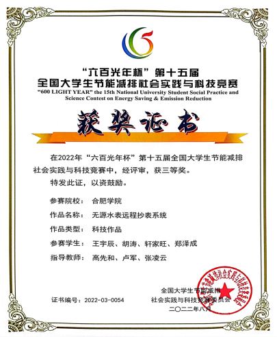 8月2日至5日,第十五屆全國大學生節能減排社會實踐與科技競賽決賽在天津舉行,我校先進制造工程學院本科生王宇辰、胡濤、軒家旺、鄭澤成的作品《無源水表遠程抄表系統》榮獲全國三等獎,充分展現了我校學子的科研創新能力、實踐能力和團隊合作精神。