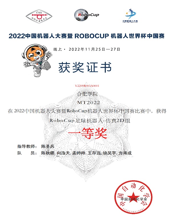 本次大賽吸引了國內(nèi)220所高校的843支隊伍、共4500多人參加,比賽項目分為足球類人組、仿真組、救援組等17個項目。我校人工智能與大數(shù)據(jù)學院的陳秋娜、向浩天、孟帥帥、方海成、王存遠、徐昊宇組成的MT2022球隊在陳圣兵教授的帶領下,與來自南京大學、中南大學、東北大學、合肥工業(yè)大學和安徽工業(yè)大學等多所國內(nèi)知名機器人球隊同臺競技,隊員們針對對手攻防特點不斷改進策略、優(yōu)化動作,最終獲得仿真2D項目組冠軍。