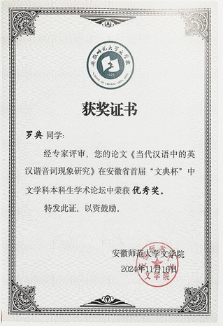 我院羅典同學(xué)在安徽省首屆“文典杯”本科生學(xué)術(shù)論壇榮獲優(yōu)秀獎(jiǎng)