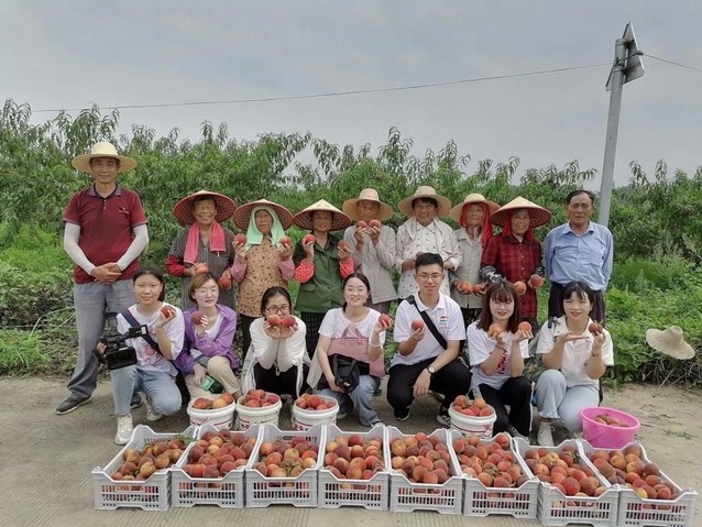 萬毅生態農業園內的產品十分豐富,果樹種植方面除了桃子,還有梨、西瓜等多種水果,種植業之外家禽養殖業也同步發展,可謂是生態經濟下的多重發展。我們重點對果樹種植業中的黃桃、翠冠梨進行了考察。一路上,農場負責人朱守萬先生為大家介紹了農業園的占地面積、土地利用率、產品的種植等基本情況,三下鄉隊長譚蒙蒙也向朱先生詢問了農產品的銷售情況、物流運輸過程等問題,朱先生都一一耐心解答。介紹完之后,朱先生熱情地邀請大家下地摘桃,成員們都躍躍欲試,在采摘人員的指導下,大家滿載而歸,并與朱先生等人合影留念,臉上都洋溢著幸福的笑容。