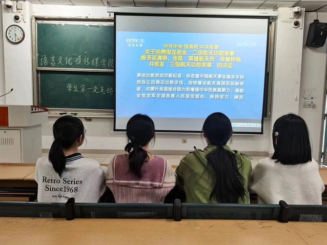 會(huì)上,學(xué)生黨員余夢(mèng)瑩帶領(lǐng)大家觀看學(xué)習(xí)中共中央、國(guó)務(wù)院、中央軍委關(guān)于給費(fèi)俊龍頒發(fā)“二級(jí)航天功勛獎(jiǎng)?wù)隆薄⑹谟栲嚽迕鳌堦憽坝⑿酆教靻T”榮譽(yù)稱號(hào)并頒發(fā)“三級(jí)航天功勛獎(jiǎng)?wù)隆钡臎Q定的軍事報(bào)道。余夢(mèng)瑩感慨道:神舟十五號(hào)載人飛行任務(wù)圓滿成功的背后,凝聚著無數(shù)人的付出與努力,蘊(yùn)含著無數(shù)個(gè)日日夜夜的奮斗。費(fèi)俊龍、鄧清明、張陸同志是不忘初心、牢記使命、獻(xiàn)身崇高事業(yè)的時(shí)代先鋒,是探索宇宙、筑夢(mèng)太空、建設(shè)航天強(qiáng)國(guó)的標(biāo)兵模范。初心不改,執(zhí)著追夢(mèng)。費(fèi)俊龍、鄧清明、張陸同志向世界展示了強(qiáng)大的中國(guó)精神、中國(guó)力量。